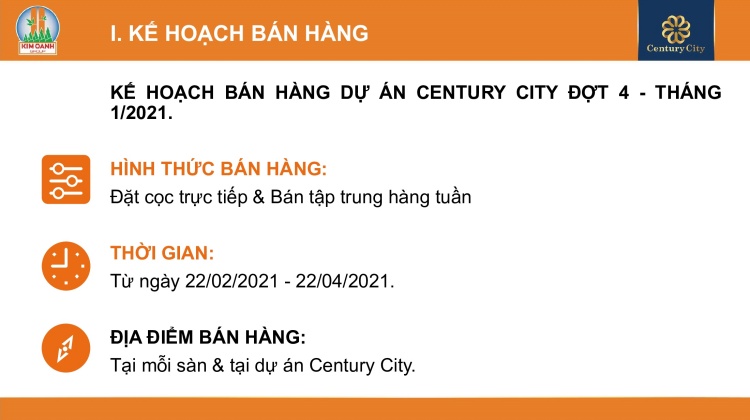 Vừa bước qua năm 2021, Công ty Kim Oanh vừa công bố kế hoạch bán Century City tại Long Thành đợt 4 tại thời điểm tháng 1/2021. Từ ngày áp dụng chính sách này từ 22/02/2021 - 22/04/2021. Với hình thức bán hàng Đặt cọc trực tiếp & Bán tập trung hàng tuần.