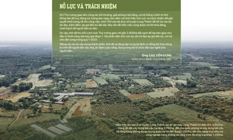 "Tỉnh đã tăng cường hơn 100 cán bộ xắn tay cùng huyện Long Thành làm ngày, làm đêm công tác kiểm đếm, đền bù, giải phóng mặt bằng để có mặt bằng sạch khu vực ưu tiên 1.810ha như chỉ đạo của Thủ tướng. Với nỗ lực trên, Đồng Nai đã bàn giao 2.600ha đất để khởi công giai đoạn 1 dự án.